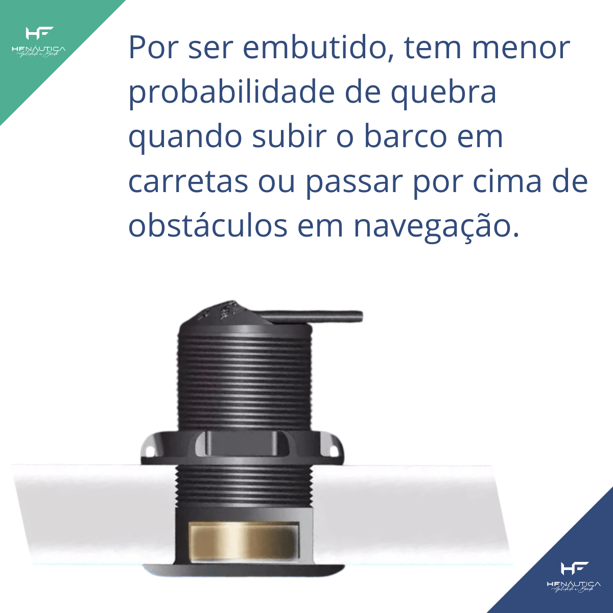 Por ser embutido também tem menor probabilidade de quebrar quando colocar o barco em carretas ou passar por cima de tocos, galhos e sujeiras ao navegar. A instalação deve ser sempre a frente de eixos, quilhas e tudo aquilo que possa gerar turbulência da água na passagem pelo transducer.