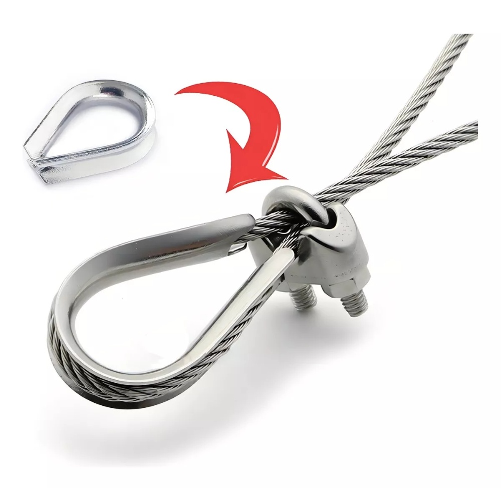 Para usar a Sapatilha para Cabos em Aço Inox, insira o cabo de aço de 8 mm de diâmetro pela abertura da sapatilha, formando um laço firme em torno dela. Certifique-se de que o cabo está seguro e tensionado corretamente para garantir estabilidade e segurança. Esta configuração permite a conexão eficiente e segura de cabos a âncoras e correntes, minimizando o desgaste e prolongando a vida útil do cabo.