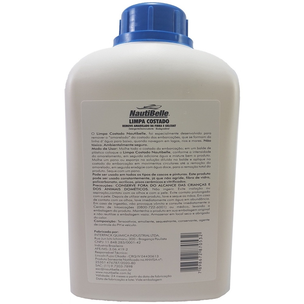 O Desincrustante Limpa Costado NautiBelle - 1 litro é um detergente desincrustante especialmente desenvolvido para remover o amarelado do costado das embarcações, que se forma da linha d'água para baixo, quando navegam em lagos, rios e mares. Com uma fórmula única, é um produto não tóxico e ambientalmente seguro, que pode ser usado em todos os tipos de cascos e pinturas. Ele é eficiente e seguro para uso constante, não causando danos ao gelcoat, fibra de vidro, policarbonato, acrílicos, pisos cerâmicos e vitrificados. Os tensoativos biodegradáveis presentes na fórmula garantem uma limpeza eficaz e eco-friendly. Este produto deve ser conservado fora do alcance das crianças e dos animais domésticos. Para uso seguro, sempre siga a recomendação do fabricante e leia o rótulo da embalagem antes de utilizá-lo.