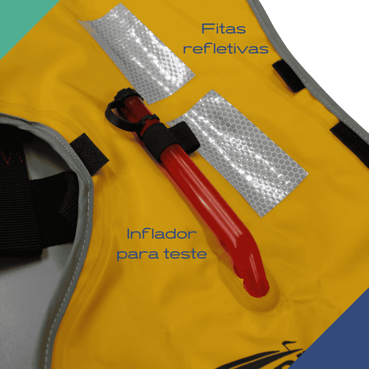 - Ativação: Automática (menos de 5 segundos após cair na água) ou manual (puxando cordel)